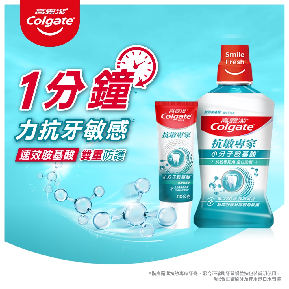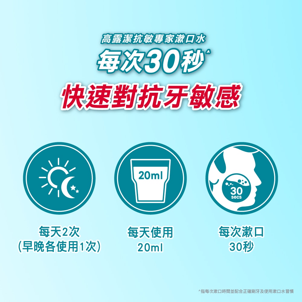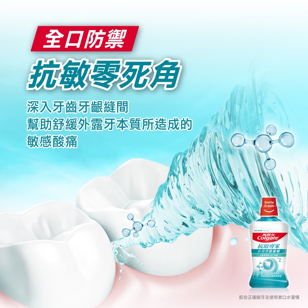 使用高露潔抗敏專家抗敏感漱口水,幫助舒緩牙齒敏感酸痛。專為敏感牙齒設計配方#,添加獨特胺基酸配方,建立綿密保護網對抗牙敏感。